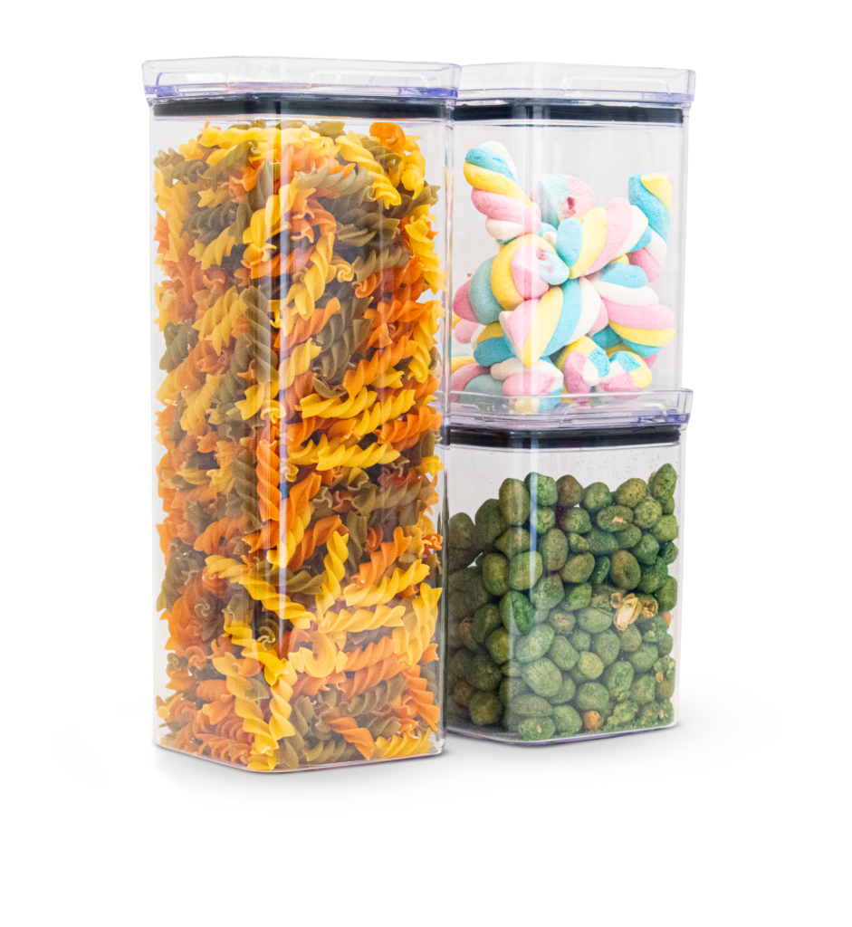Potes herméticos para cozinha e colmeias para closets e gavetas.